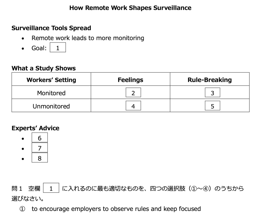 (リモートワークの影響というテーマの英文から作成した第5問型のワークシート・設問)
