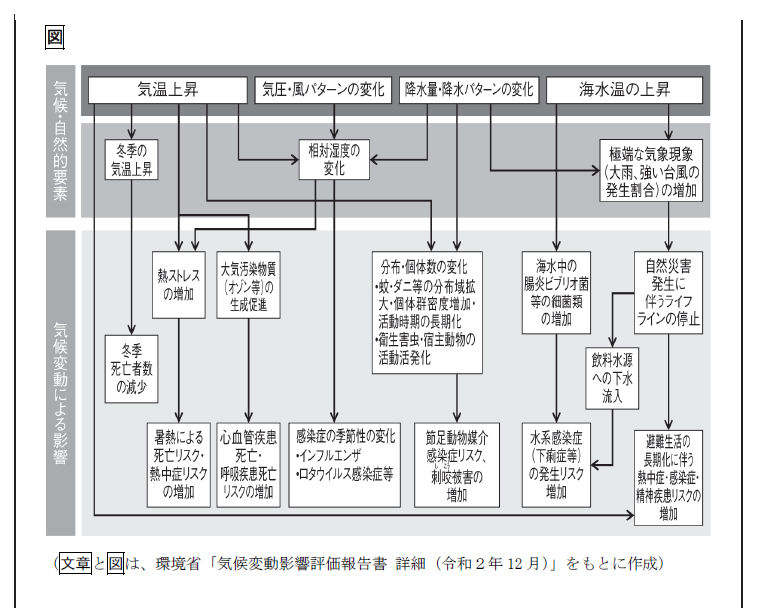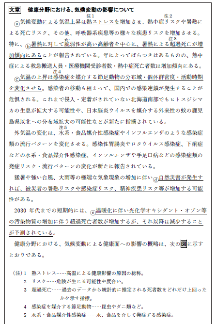 一方eを確認しますと、述部に「予測される」とあります。図の下部を見てください。「気候変動影響評価『報告書』」とあります。いうまでもなく〝報告書〟に〝予測〟が書かれることはあり得ません。したがって、正解は①とすぐに判断できます。